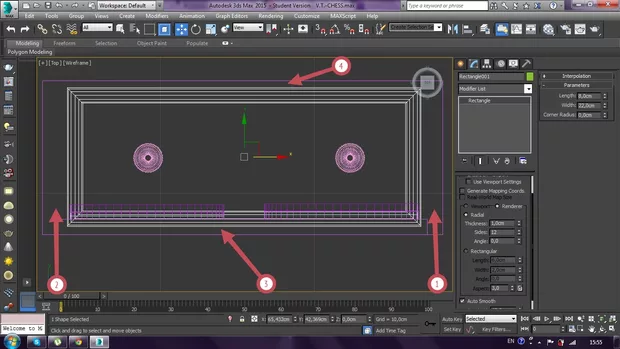 Здравейте, опитвам се да спазвам почти всички указания,които давате при изчертаването на обектите, но някак си не ми харесва, че го правя на око. Бихте ли ми обяснили как да спазвам точни разстояния? Примерно при изчертаването на основата на часовниковия индикатор, как да я направя на равни разстояния от ръбовете на кутията? Искам разстояние (1) да бъде равно на разстояние (2), а също и (3) да бъде равно на (4).