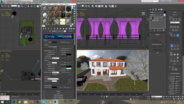 - върху едната равнина, която е импортната от AutoCAD, има някакъв проблем, замени я с Plane в Мах. Тревата във Vray има малко по-лесен начин да се получи, който е и доста "по-лек" за PC-то, но може би малко по-различна като ефект. Но можеш да пробваш следното, което е много често използвано като похват за големи площи. Метода е с модификатора VrayDisplacementMod, приложи го върху равнината (върху която има текстура "трева") и в модификатора в "Texture" сложи чернобяла карта на малки бели течки на черен фон (cellular map). От Amount регулирай височината, а от tiling-a на картата - гъстотата.