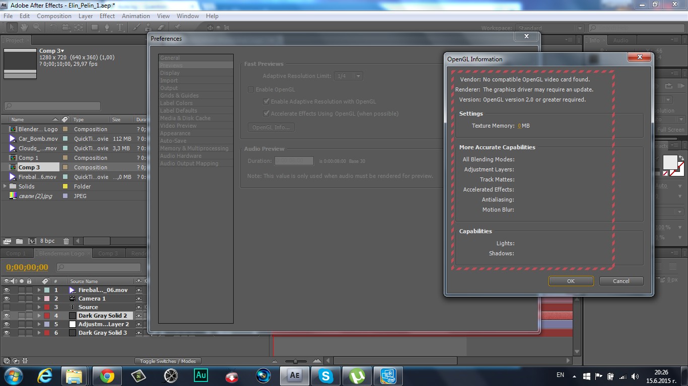 Каква е причината затова нещо, което се случва. Предоставям снимки. Ще помоля някой от специалистите, ако може да ми обърне внимание. Използвам вградената видео карта на лаптопа, защото външната изгоря още в самото начало. Знам как се пуска OpenGL, обаче просто не мога да го избера. Вижте на снимките настройките на видеото и АЕ.