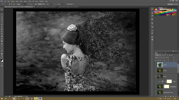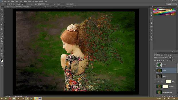 Браво, качествена обработка :) Може да пробваш да добавиш реални форми в косата. Например снимани хвърлени листа или нещо подобно :)