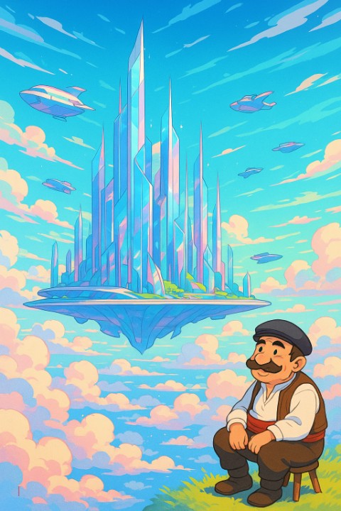 „Футуристичен град, плуващ над облаци, с кристални небостъргачи и летящи кораби, в стил аниме с ярки пастелни цветове, с усещане за свобода и приключение“