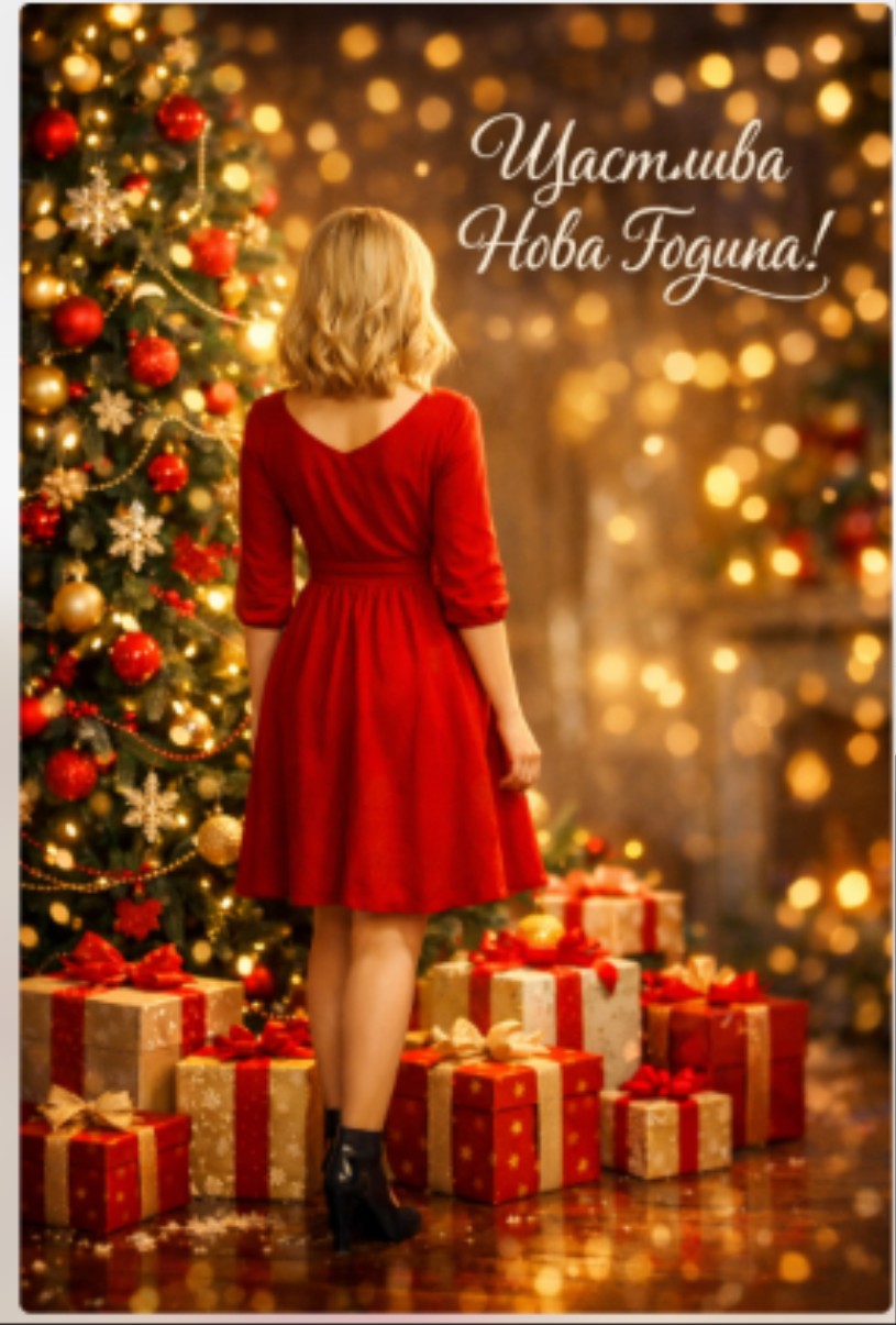Генерирах изображение със следната задача: ''Създай романтично изображение като картичка за Нова година. Да е приказно и романтично, да създава коледно настроение. Руса жена със средно дълга коса във всекидневна стая, в полугръб и в цял ръст, облечена в червена рокля, до украсена коледна елха с кутии с добре опаковани подаръци около елхата. Замъглен фон – боке. Сложи надпис на български горе в дясната част на изображението.''