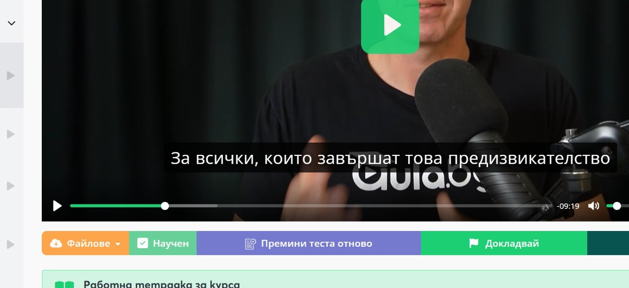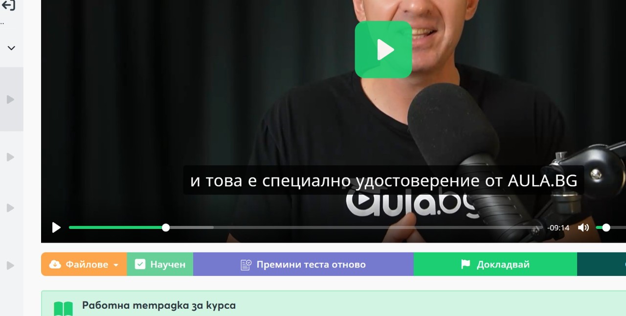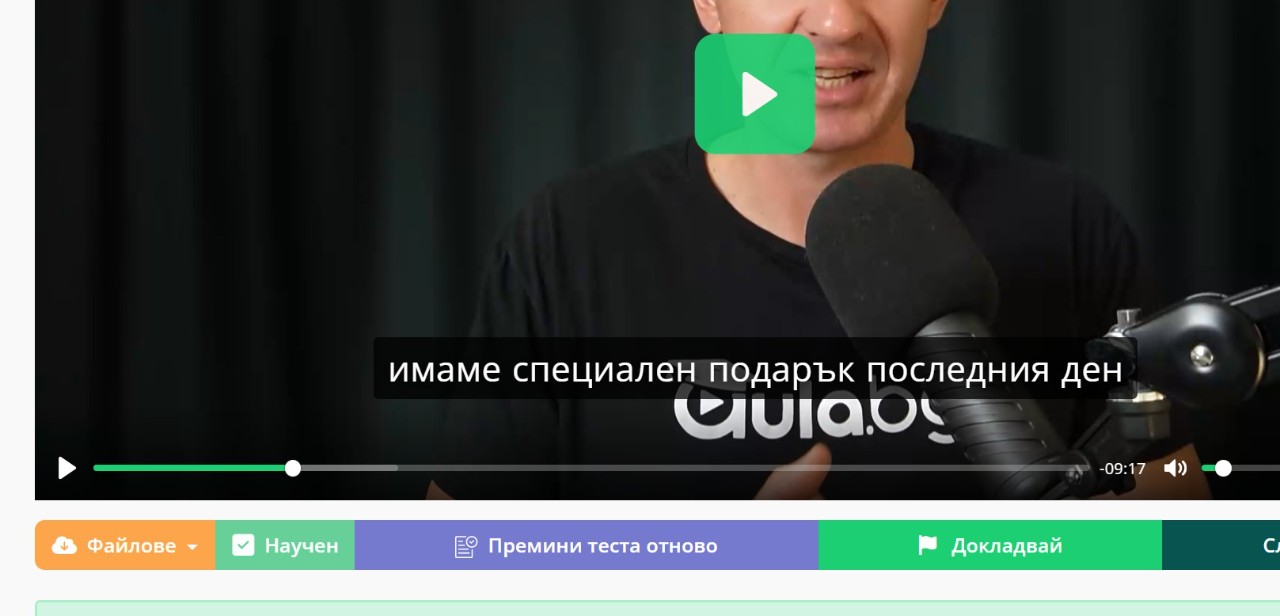 - Проверете дали във всеки урок е отбелязано, че е научен. Това се прави чрез бутона "Научен" под видеото.