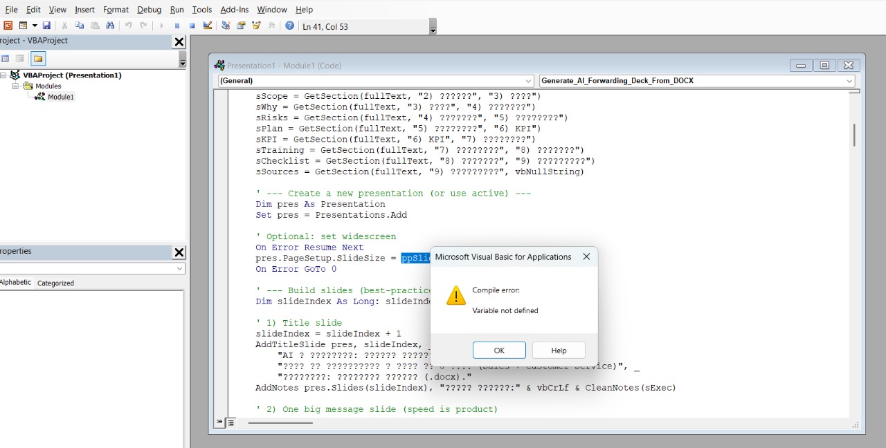 Здравейте, Яна, проблемът Ви възниква, защото в началото на Вашия код вероятно е активирана настройката Option Explicit, която изисква всяка променлива да бъде предварително декларирана, а променливата ppSlideSizeWidescreen (която е маркирана на екранната снимка) не е разпозната от системата.