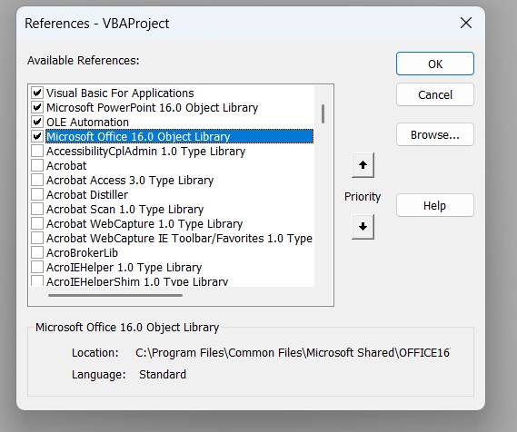 Tools→References(Инструменти → Препратки). - В списъка отбележете Microsoft PowerPoint xx.0 Object Library (в зависимост от вашата версия на Office).