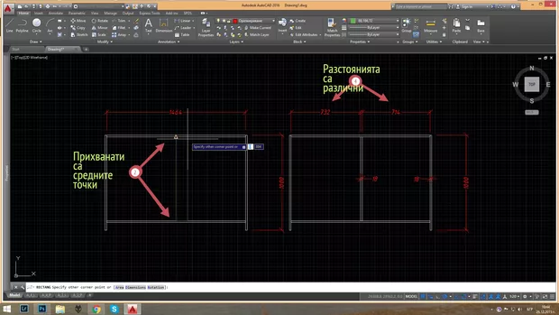 Здравейте, Има ли някаква възможност правоъгълника ми да започва от средата? Примерно, искам да начертая шкаф с един делител по средата. Добре, обаче когато чертая правоъгълник и избера за прилепване средна точка ( Midpoint) правоъгълника се изчертава винаги в едната страна, т.е. измества се с една дебелина, защото правоъгълник се построява по принципа :точка -срещуположна точка. При това положение моето изискване няма да е изпълнено, правоъгълникът (делителя) да е точно в средата. Ако го премстя след изчертаването се получава нужния резултат. Обаче това са две операции, отнемат по-вече време. Мога ли да го изчертая наведнъж?