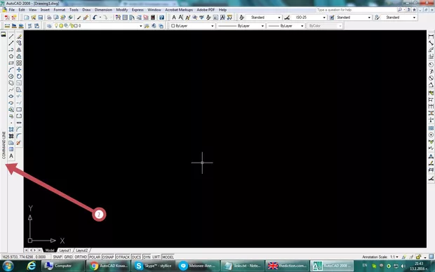 В резултат на невнимателно движение с мишката/чукнах я в клавиатурата до нея и се задействува левия бутон/ командния ред се премести отляво по вертикала. Не успях да видя как стана, но сега когато отида с мишката върху полето му той се "експлорва" надясно и покрива половината екран. Опитах със съвета към Красина, но той не се "хваща". Ползвам го при работа и бих желал да го върна долу.