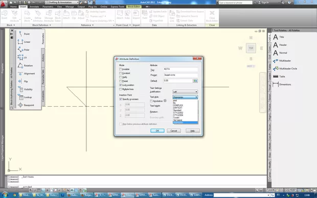 Здравейте, опитах се да създам собствен блок за вертикална кота с атрибут, но шрифта ми винаги става много малък.Предварително имам вкарани в палетата с инструменти палети със шрифтове нормален, заглавие и голям и асоциативни коти.Но нещо не се получава.Може ли да ми помогнете къде греша? Като следвам урока и правя упражнението на файла от Аула - се получава, но тук на моя чертеж - нещо се обърква със височините на шрифтовете.