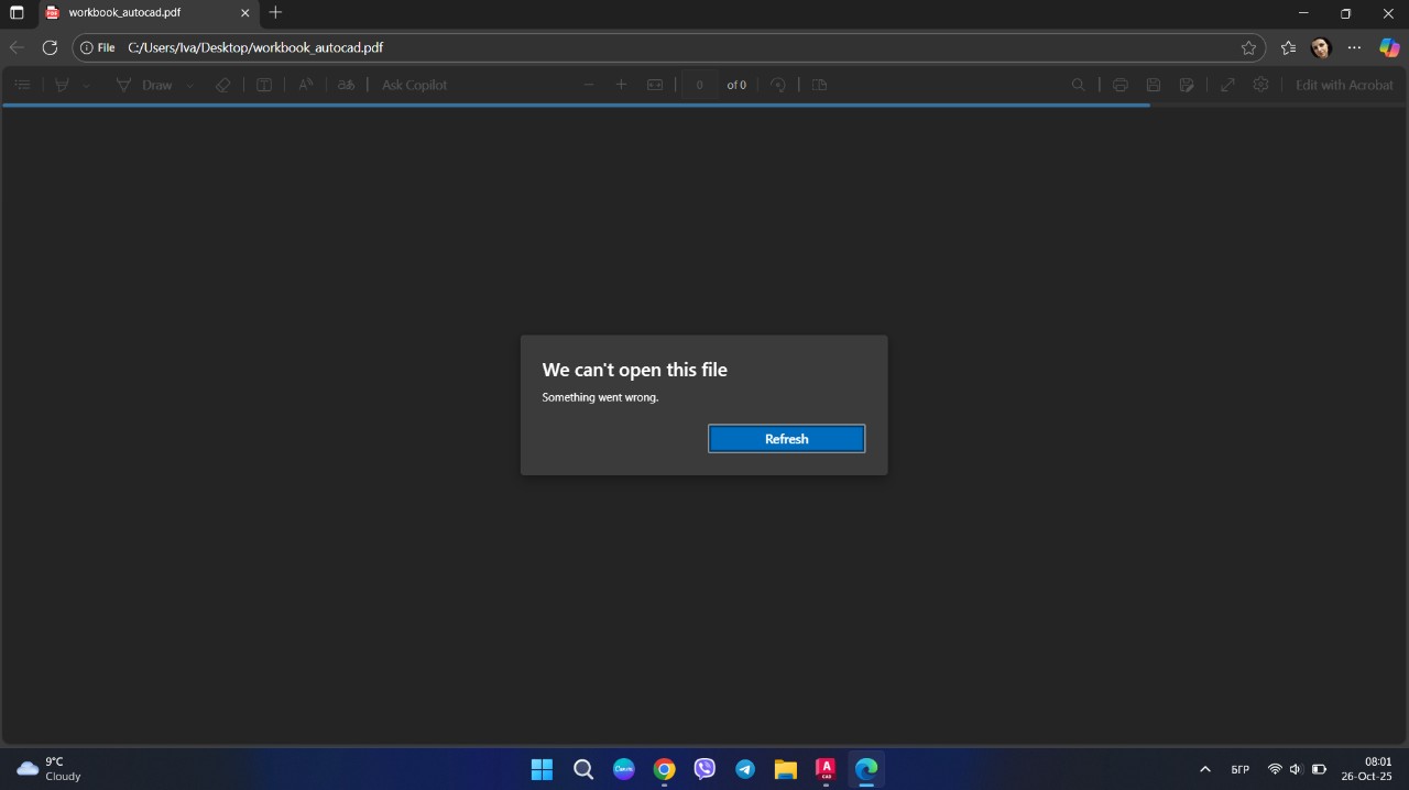 Грешката, която виждате, не е свързана конкретно с AutoCAD 2026, а най-вероятно с PDF файла или начина, по който се опитвате да го отворите. Работната тетрадка е в PDF формат и не би трябвало да има връзка с версията на AutoCAD, тъй като тя не се отваря в AutoCAD, а в четец на PDF файлове.