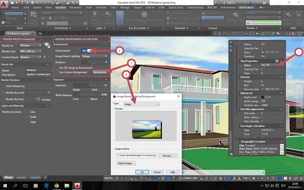 В AutoCAD 2016 версия Advanced Render Settings има друг облик, казва се Render Presets Manager, и много от настройките показани във видеото липсват, примерно не можах да открия настройки за фотони, Global Illumination и т.н. Следователно не мога да включвам едновременно и фона и Sky Background and Illumination, а това го правя от палетата Render Environment & Exposure (Снимка 1), но не знам дали дава същия ефект, т.е като ми е включен Environment задния фон, който съм сложил при създаването на поглед с камера, изчезва, но ако го слагам от Environment с опцията Use Custom Background се появява, но при всички случаи с включен Sky Background and Illumination нямам фон.