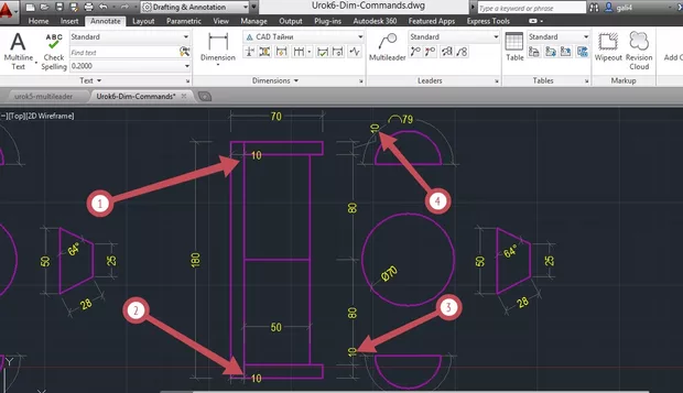 Защо оразмерителната линия и текста се прилепват към чертожната линия - стрелки 1 и 2 и как да преместя текст от другата страна на оразмерителната линия - стрелки 1,2 3 и 4. Версията на Аутокад е 2014. Благодаря предварително за отговора