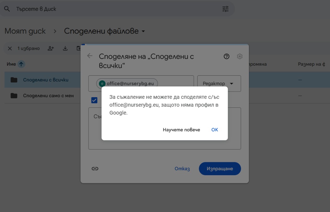 Проблемът, който сте срещнали, е напълно нормален в контекста на работата с Google Drive. При опит за споделяне на папка с имейл адресу, който не е свързан с активен Google профил, ще получите точно такова съобщение за грешка.