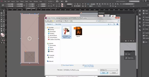 Ако искаш да използваш работните файлове към урока отиди в Window-Links panel. Когато отвориш панела трябва да виждаш всички снимки. Ако до тях има въпросителни кликни върху тях, след отварянето на диалоговия прозорец избери папката, в която се намират изображенията.