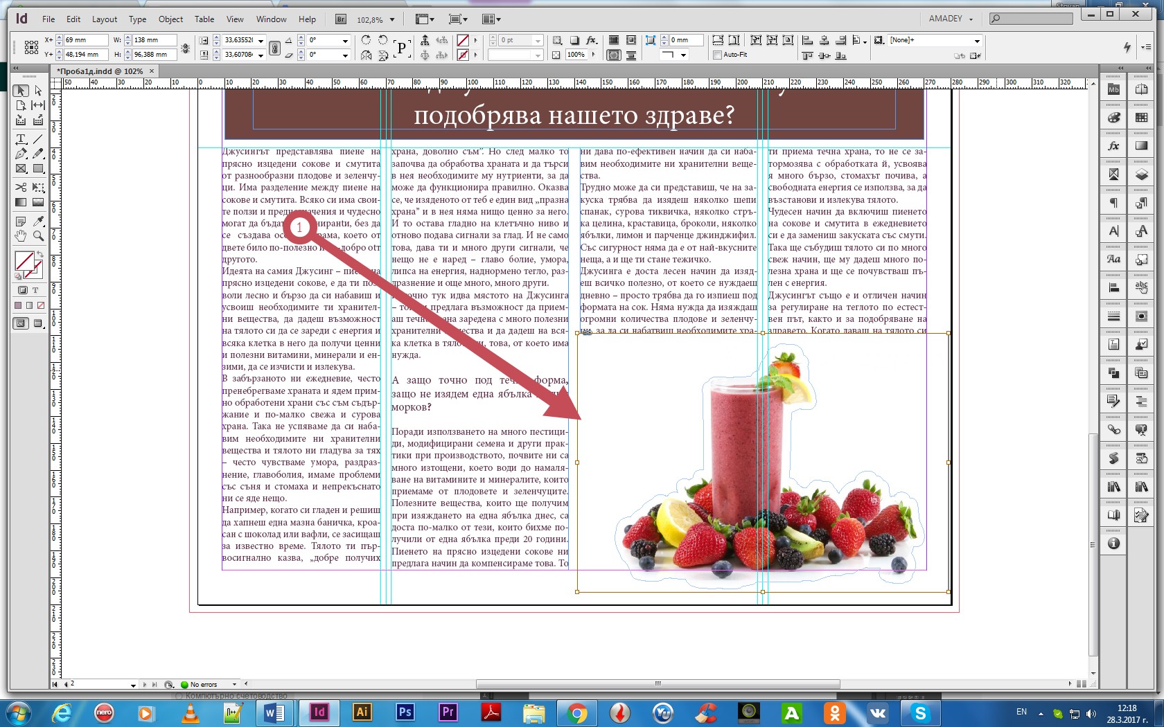 Здравейте! Уважаеми колеги, работя с версията посочена в курса –CS6. Моля за помощ при решаване на следния проблем. При упражненията за създаване на дипляна, след доста успешни опити изведнъж на 2-ра страница при поставяне на картинката се появи проблем, който не успях да реша. Ето как изглежда: