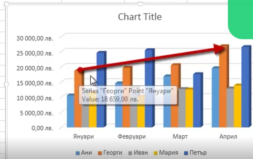 Здравейте, Асен, стрелките върху диаграми в Excel се добавят чрез инструмента Shapes от менюто Insert. Във Вашия случай червената стрелка е добавена като Shape върху диаграмата, след което е позиционирана така, че да илюстрира тенденция.