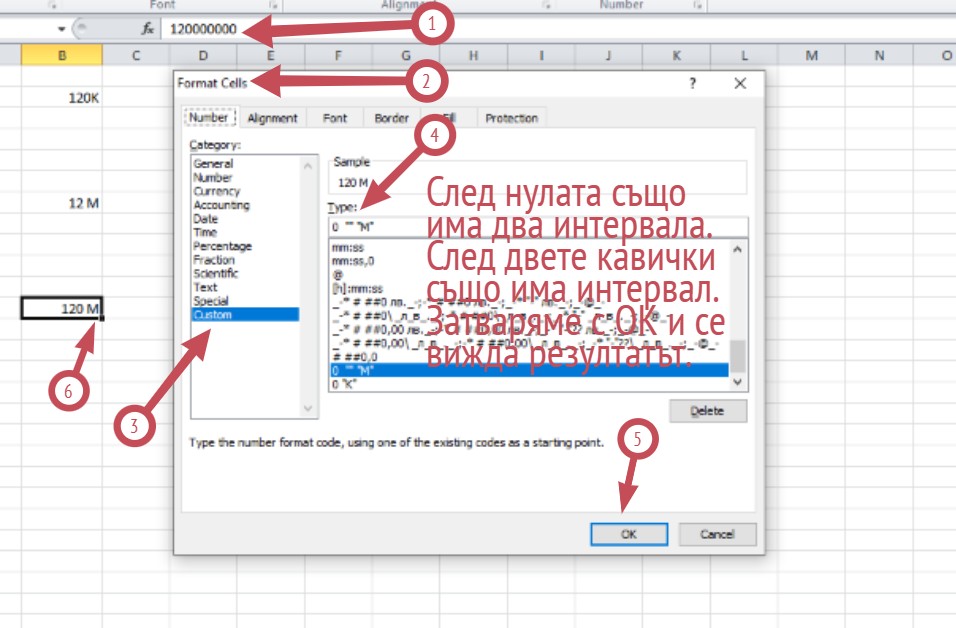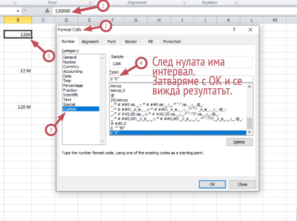 За да визуализирате големи числа в Excel, като скриете нулите за хиляди или милиони, трябва да използвате точка и запетая (;) или запетая (,) като разделител за хилядите в потребителския числов формат (Custom Number Format), в зависимост от регионалните настройки на Вашия компютър и версия на Excel. В българските регионални настройки, където запетаята (,) е десетичен разделител, точните разделители за хиляди при създаване на custom формат са запетаята (,) или символът за разделител на хилядите, който е дефиниран във Вашите Regional Settings. Често, за да скриете хилядите, се използва запетая (,) в края на формата.