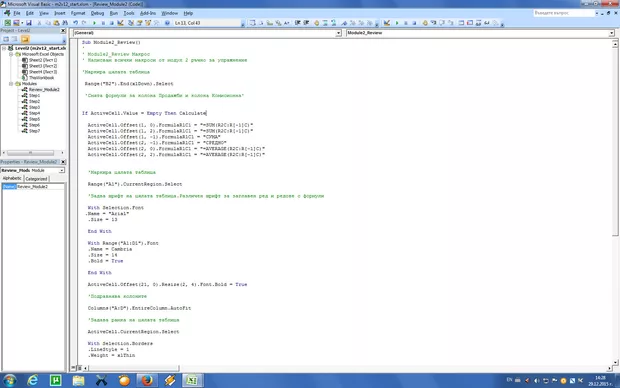 Здравейте Цветелина. Така както сте написали процедурата може да използвате HasFormula=False (в модул 2, урок 5 има подобен пример).Тук искам да направя едно уточнение: предполагам, че Calculate е процедура, която попълва колоните на таблицата преди да изчисли Сумата и Средно аритметичната стойност (от картинката не се вижда Calculate). В такъв случай е коректно проверката да се извършва за колоната, в която се попълват формулите (например колона C), т.е. в първата инструкция на процедурата вместо Rаnge("A1") да се запише Range(C1").End(xlDown).Select.