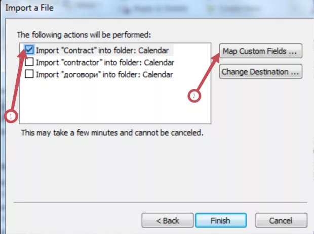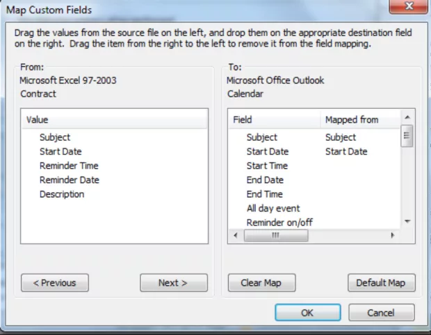 Предполагам, Бригита ;-) На последния прозорец отгоре пише да завлечеш от лявото поле каквото искаш към дясното срещу съответното име. Т.е. да хванеш с мишката Reminder Time от лявото поле и да го завлечеш срещу Reminder Time от дясното. Логиката на импорта според мен казва, че стойността от лявото поле ще се въведе под съответно име в дясното поле.