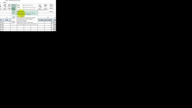 Трябва да сме позиционирали в клетка B2 преди да изберем Freeze panes.
