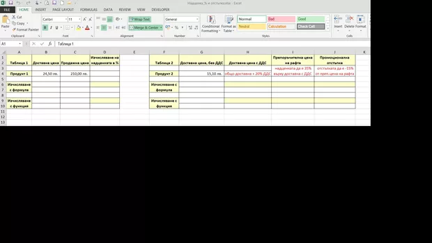 Как може да се изчисли колко % е надценката от продажната цена (таблица 1). Как се добавя надценка към доставната цена и да как може да се изчисли промоционална отстъпка от продажната цена (таблица 2)?
