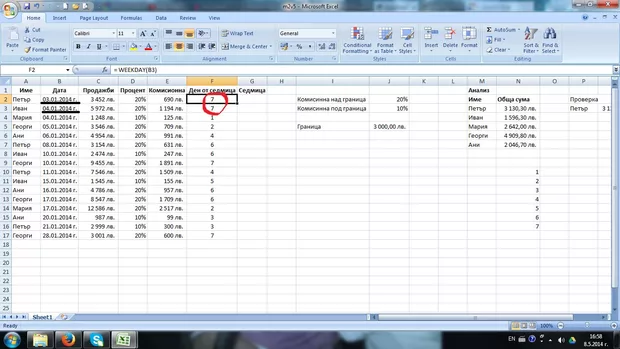 Мария, проблема обикновено идва от това че не се уточнява кой е стартовия ден във формулата ако изпишеш. На снимка 1 съм показал едно съм показал разликата в подредбата, а на снимка 2 пък съм посочил как съм изписал формулата в първия случай - съм я изписал без пояснение и съответно директно е прието неделя да е първия ден от седмицата, докато във втория случай вече съм казал чрез 2 ката че понеделник е първия ден от седмицата - в уроците даже мисля че беше пояснено за този проблем, ако разбира се от там идва проблема.