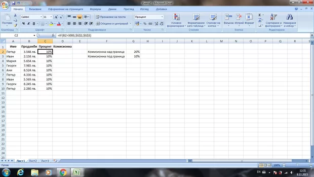 Формулата е изписана правилно. Според мен проблема е в колона В. Проверете какво наистина се крие зад форматирането на колоната. Кликнете например в клетка B2 и вижте какво пише във формула бара. Там ще видите 3.548 лв. ако в клетката не е поставено число, 3.548 ако всъщност в клетката е това число, т.е по-малко от 3000.