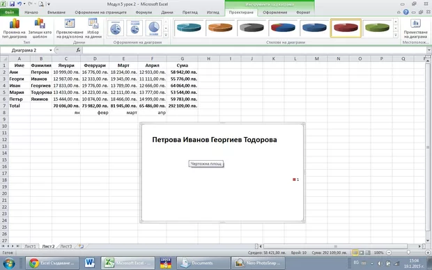 2. Диаграма - маркирана е една зона с данни "Сума" и колоната с Фамилиите, за легендата (за маркиране на несъседни зони се използва помощен клавиш CTRL). Избран е изглед с показване на проценти върху секторите, както и легенда и заглавие.
