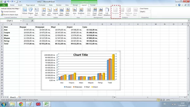 Искам да добавя trendline в колонна диаграма, но опцията не е активна, моля за съвет.