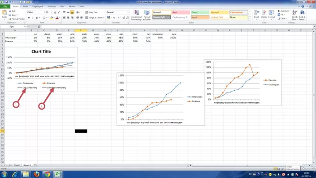Пробвах различни варианти на линейната диаграма от урока.Получих две тренд линии Една реална линия на тенденция и една планирана.Нещо ме смущава.Би трябвало тренд линията да е една или има различни варианти, което аз без да разбера как, съм направила