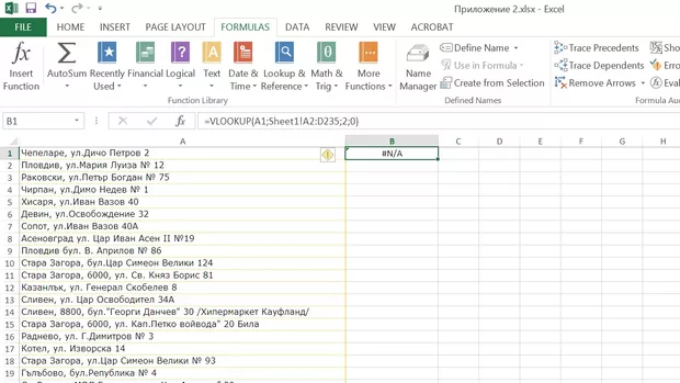 Как да направя търсенето без да дава грешка? сн.1-база данни, сн.2 опит за vlookup. Искам да сложа номера на всеки магазин след адреса или преди него.