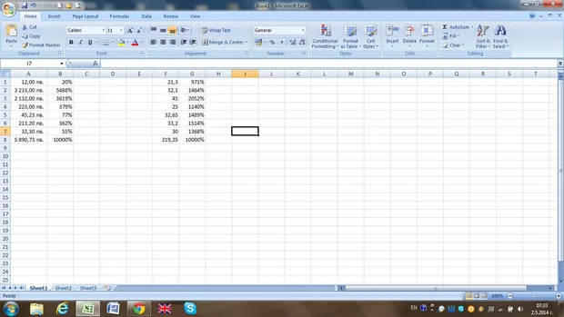 Първо сте написали числото и след това сте задали тип "процент". ако първо зададете типа "процент" и после въведете числото - всичко ще е на ред! Ще се опитам да Ви дам възможно най-добрия съвет: Преди да въвеждате каквато и да е стойност в която и да е клетка ПЪРВО FORMAT CELLS и после въвеждайте. Не се осланяйте на автоматичното задаване на типа - ще берете ядове!