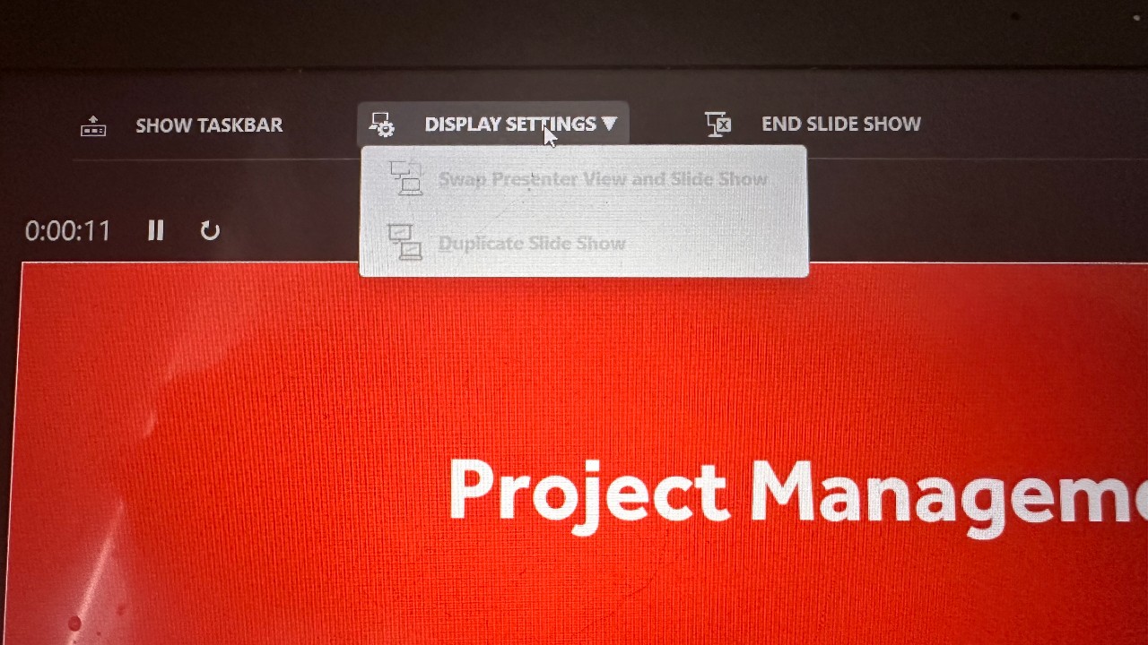 - Може да използвате функцията Display Settings > Swap Presenter View and Slide Show, за да размените екраните, ако са обърнати ролите.