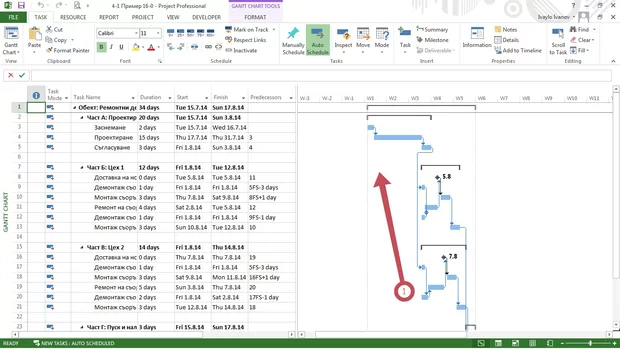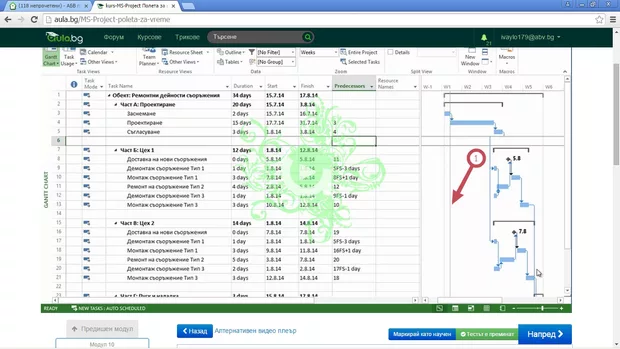Сигурно съм забравил нещо от предишен урок, (за съжаление не мога да си спомня точно кой), но каква е тази линия във видеото на урока (стрелка 1 от картинка 1) и защо я няма в примера 16-0.mpp (стрелка 1 от картинка 2), и как се въвежда и маха? Благодаря.