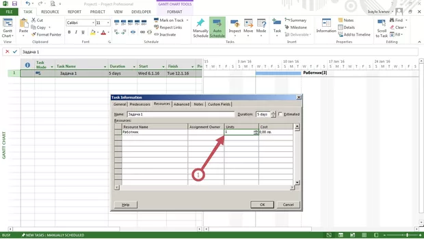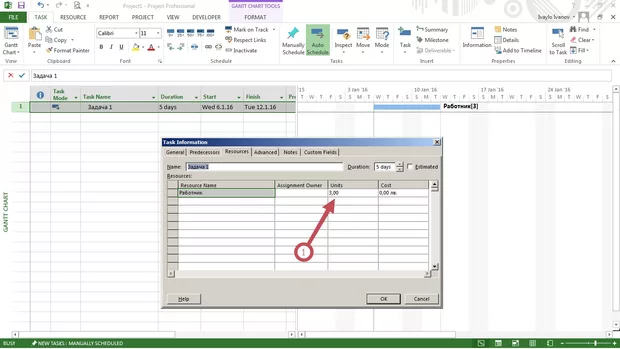 4. Отивам пак в Task Information и виждам, че в Units работниците са станали автоматично 3-ма (нали бях поставил 1?) (карт. 4);