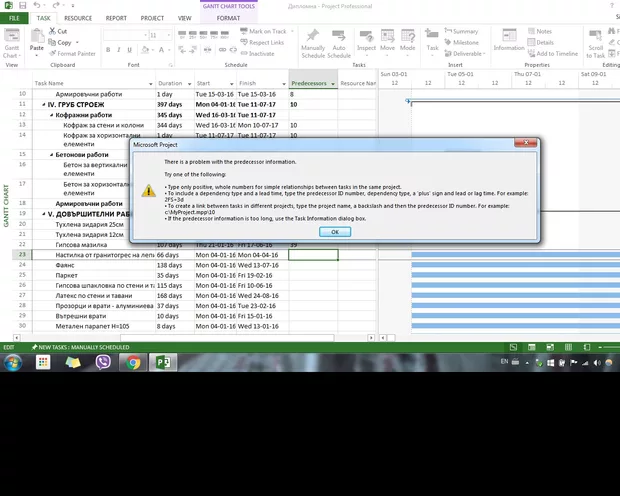 Когато се опитам да изреда, че една работа започва след две други, примено в Predecessors за работа с ID #23, искам да запиша "20;21", ми изписва следната грешка:
