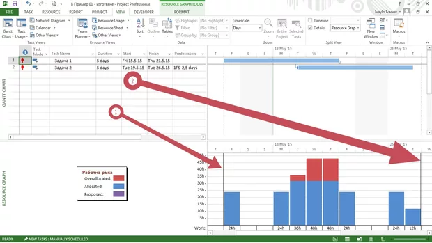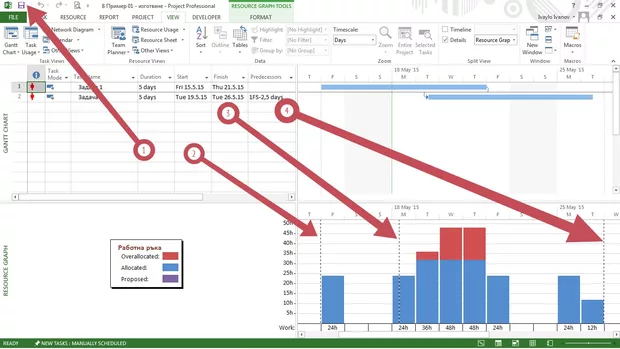 Защо, моля, след като съм задал от Gridline (със стрелка на мишката в полето на диаграмата Resource Graph, а не със стрелка на мишката в полето на графика, където Gridline е различно от другото Gridline (в полето на диаграмата) да не се виждат Current Date, Project Start и Project Finish, а да се вижда само Bottom Tier Vertical (стрелки 1 и 2 от картинка 1), всичко е наред докато не поискам да запаметя (стрелка 1 от картинка 2)? След запаметяване нещата се променят и се появява картинка 2 с промените, посочени със стрелки 2, 3 и 4 (Bottom Tier Vertical изчезва, а се появяват някакви три прекъснати линии). Вярно, първата и третата от тях са точно на мястото на Bottom Tier Vertical, но са други - прекъснати и не с дебелината и цвета, зададени от мен преди запаметяването. А средната линия? Тя каква е? Благодаря.