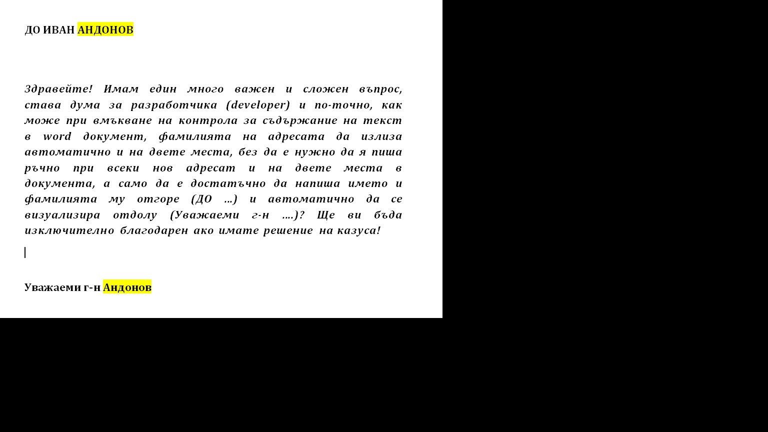 Здравейте! Имам един много важен и сложен въпрос, става дума за разработчика (developer) и по-точно, как може при вмъкване на контрола за съдържание на текст в word документ, фамилията на адресата да излиза автоматично и на двете места, без да е нужно да я пиша ръчно при всеки нов адресат и на двете места в документа, а само да е достатъчно да напиша името и фамилията му отгоре (ДО …) и автоматично да се визуализира отдолу (Уважаеми г-н ….)? Ще ви бъда изключително благодарен ако имате решение на казуса!