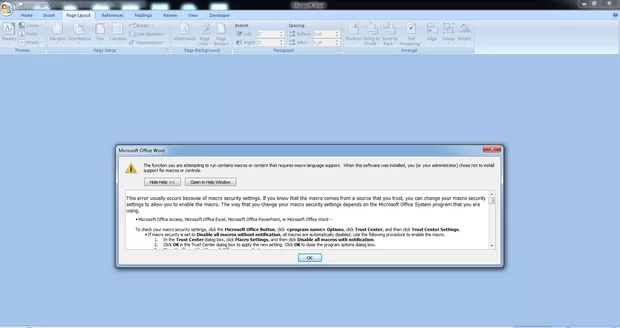 Здравей, влез в microsoft бутона ( при мен пише File т.к. съм с версия 2013 ) след което отиди на Options, след което отиди на Trust Center, след което отиди на macros settings, след което дай тикче на Disable all macros with notification ( общо взето следвай последователността показана на снимката ) след което затваряй всички прозорци с ОК и пробвай да видиш дали ще имаш същия проблем.Надявам се да съм бил полезен с отговора си.
