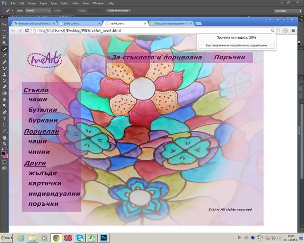 Направих файл 1024 на 800 пиксела, записах го Save for Web, но когато отворя html-a излиза огромен, чак когато намаля мащаба на 25% се вижда нормален? Проблемът е в размера на файла или в Chrome, чийто мащаб по подразбиране е 100%?
