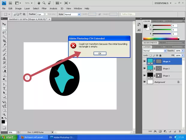 Грешката казва, че не сте избрали нещо което може да се трансформира. Натиснете на сивото квадратче в слоевете (векторната маска)