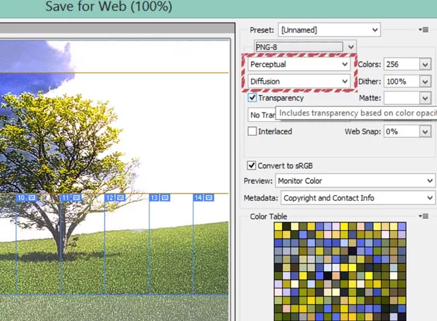 Това са различни алгоритми с които се редуцират цветовете в PNG-8. Можеш да избереш Colors:16 и да видиш по-голяма разлика. Най-добре е да използваш PNG-24 тогава няма редуциране на цветовете. Файла става по-голям, но не би трябвало да има значение. PNG-8 можеш да ползваш при специални случаи, ако например сайта ти ще използва прекалено много снимки и трябва да са по-оптимизирани.