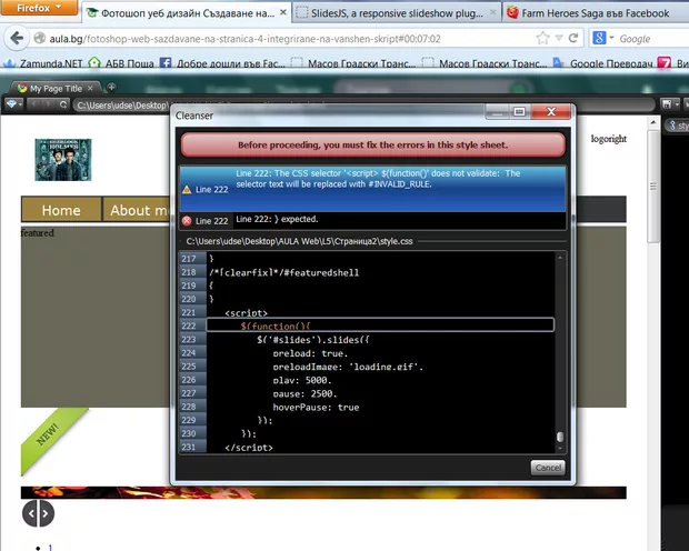 Показва ми тази грешка, когато отворя страницата в stylizer и не мога да продължа напред. Скрипта го копирах директно от архива и няма разлика с този в HTML файла. В конзолата на хром няма грешки и всички бутони за смяна на картинките работят, сменят се и автоматично.