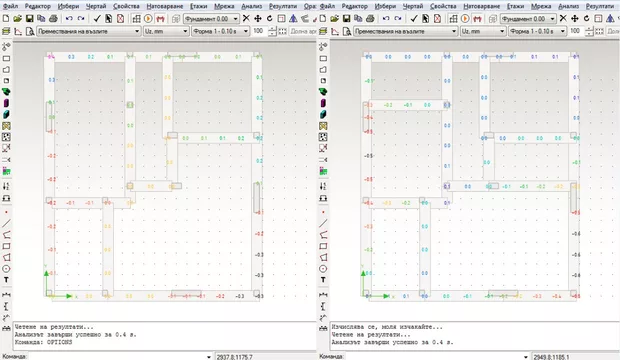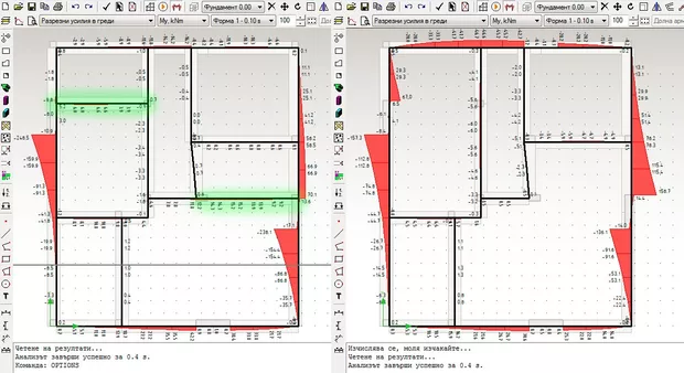 При премахване на ивичните фундаменти в зелено, моментите в ивиците при шайбите са с ясно изразена опънна и натисната зона. Когато обаче се оставят фундаментите в зелено, РУ в ивичния фундамент на шайбата в ляво на схемата, са по-големи отколкото ако го няма - (изглежда така сякаш ивичния фундамент спира до шайбата) . Преместванията също са само с (-)знак докато в другия случай са с (+ и -). Модела е на жил.сграда на 1ет.