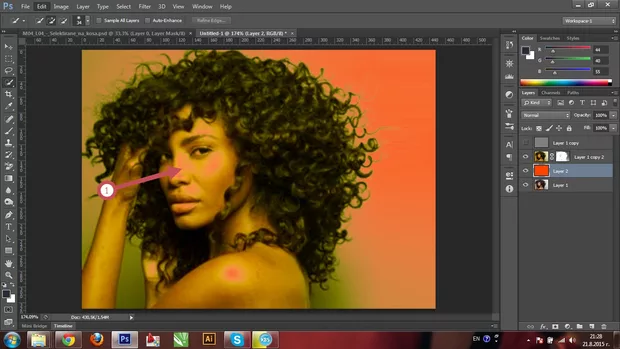 в прикаченото изображение аз съм направил до някъде същото -> фон, отгоре лицето и един Hue/Saturation adjustment layer, с намалена Lightness , който е Clipping Layer на слоя с лицето (Alt + click между двата слоя ... или гледай следващото видео :) ) и с черна четка рисуваш в маската на Hue слоя (гледай от следващият модул видеото с папагала)