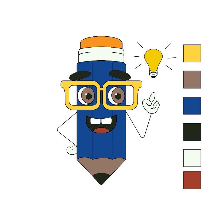 Много добре сте се справили с подбора на цветове и самата идея с очилата и крушката е много оригинална – създава усещане за умен и вдъхновяващ герой! Формите са чисти, цветната палитра е балансирана, а изразителността на лицето придава живот на Идейко – точно това е целта в урока за цветове и детайли.