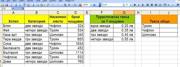Здравей, предлагам едно решение, дано да съм разбрала правилно идеята. Първо трябва да получим таксата за броя нощувки спрямо звездите на хотела. Затова е хубаво да се добави една колона към първата таблица. След това ще направим един if, който ще проверява колко са звездите и ще умножава брой нощувки по таксата. И накрая ще направим един SUMIF, който ще сумира тези крайни такси в зависимост от населеното място. Функцията на изображение 1 проверява дали хотела е една звезда;ако е умножава по цената за една звезда; ако не е проверява дали са две звезди и т.н. Надявам се цветово да се ориентираш. На изображение 2 се вижда функцията за събиране спрямо някакво условие. Мисля, че така се получава търсения резултат. Ако не е била това целта пиши пак :)
