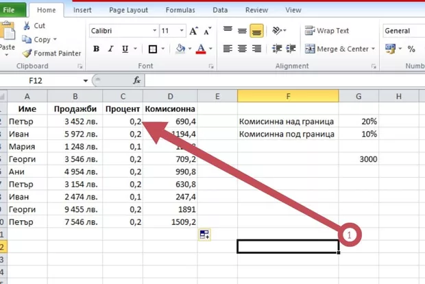 Маркираме клетката или колоната и избираме символа % от рибън лентата