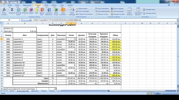 Едно от условията е: "Пътни" - ако транспортът е служебен, пътните са нула, иначе стойността се взема от работен лист "Пътни" (дали от друг лист или от съседни клетки не е от голямо значение). Направих формула, но или не е правилната или пропускам нещо, защото, като се опитам да форматирам клетката за стойността "0" да излезе примерно " - лв." не се получава, а ако го задам това (лв.) във формулата се бърка формулата на "Общо". Създадох и диаграма, която също се обърква от факта, че явно клетките не са форматирани правилно.