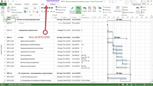 Здравей, трябва да влезеш в Project Options -> Customize Ribbon -> Main Tab -> тикче на Developer -> Ok
