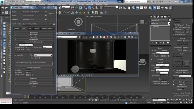 Сцената като цяло е много проста и нарочно е подбрана такава с голям прозорец отпред - за да може осветяването вътре да е по-лесно и да не се затруднява допълнително. Задължително използваме GI - в случая ще работи и по-бързо ако използваш IM+LC (пробвай), BF сравнително рягко ще се наложи да го използваш. Защо използваме GI - зашото основното осветление което ще използваме да осветим сцената е индиректно - идва отвън. Когато влезе светлината през големия прозорец, с използването на GI ние казваме "позволяваме ти да осветиш обектите вътре с отразената светлина, която идва отвън...". Ако GI е изключено ще кажем точно обратното и светлината след като се отрази веднъж, ще "спре да пътува" в помещението и рендера ще остане много пъмен и нереалистичен.